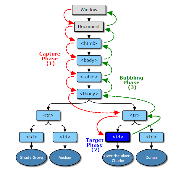 捕获从window开始,到document,再到html,再到body,再到被点击元素的祖先元素,再到被点击元素的父元素,最后到被点击的元素。一级一级往下找,有监听事件就执行。用一幅图描述,如下: